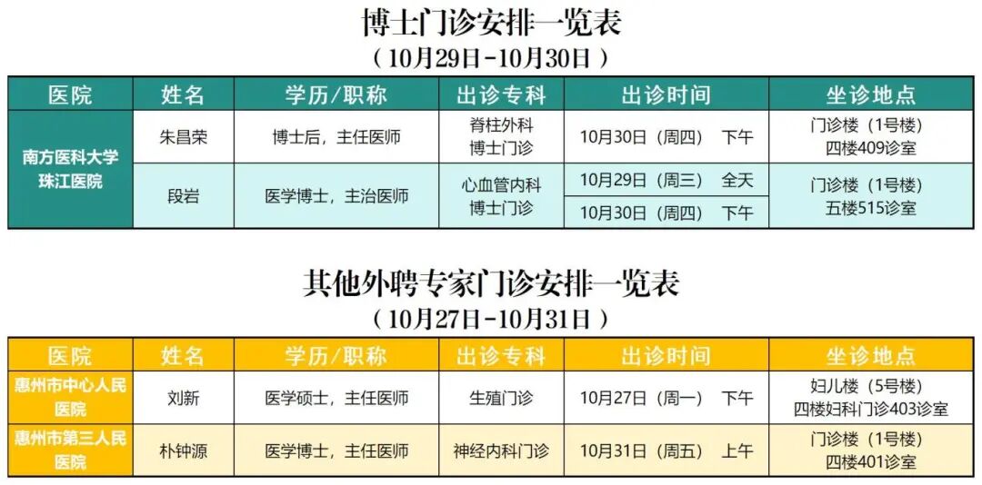 攜手共建醫聯體 讓惠陽群眾在家門口享受 省、市級三甲醫院同質化服務 為提升醫院專科特色優勢 ,本著“共建共享、合作共贏、協同創新、共同發展”的理念,惠州市第六人民醫院與南方醫科大學珠江醫院、廣州醫科大學附屬腫瘤醫院、惠州市中心人民醫院等三級甲等醫院簽約共建緊密型專科聯盟,由省級專家團隊定期駐惠州市第六人民醫院出診、查房、手術,為惠州六院提供優質醫療資源、人才和技術支持,全力促進惠陽區衛生健康事業高質量發展,更好滿足百姓健康服務需求。 10月27日-10月31日排班情況如下 (具體以掛號時間為準) ▽點擊圖片可放大查看 專家簡介