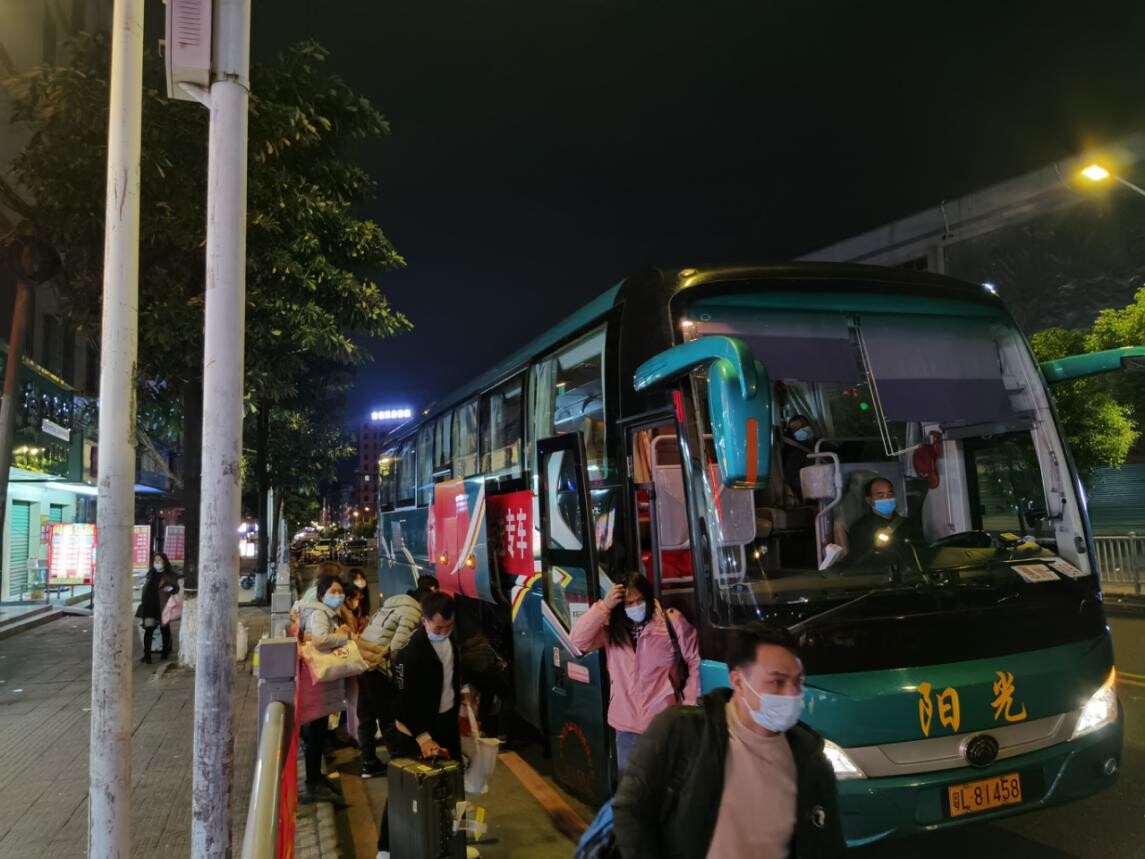 包機在當日晚上11點抵達。惠陽人社局接站工作組早已提前到位,剛出站臺,務工人員就被工作組有序安排上了惠陽區人社局準備的從平潭機場直達惠陽伯恩公司的大巴專車。