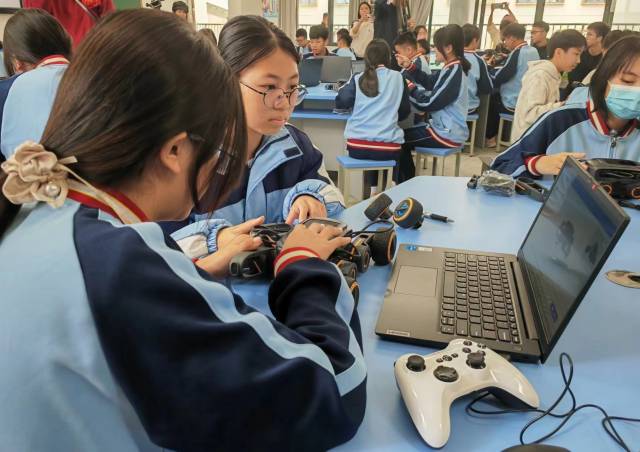 日前,在惠陽區第七中學及附屬小學人工智能教育項目科學實驗室內,學生們在專業老師的指導下,在電腦上輸入代碼指令,遙控變形車做出前進、后退等指定動作。一堂《AI城市奇兵》主題課程為師生打開“新視界”。