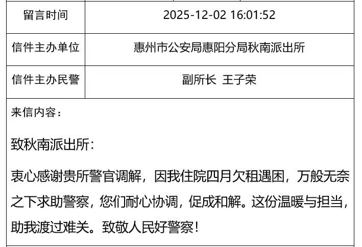 惠陽公安始終默默堅守在為民服務的第一線,用實際行動書寫著溫暖篇章。近日,惠州市公安局局長信箱收到市民薛先生的一封感謝信,字里行間飽含著對惠陽公安的深深感激。