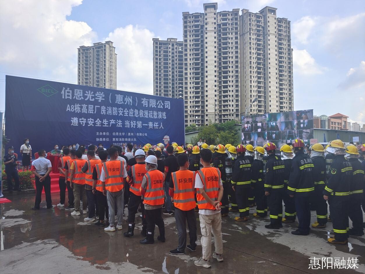 日前,由伯恩光學(xué)(惠州)有限公司主辦、惠陽消防救援大隊(duì)協(xié)辦的伯恩光學(xué)(惠州)有限公司消防安全應(yīng)急救援疏散演練活動(dòng)順利舉行。惠陽消防救援大隊(duì)、淡水消防救援站、秋長(zhǎng)專職消防隊(duì)、伯恩光學(xué)企業(yè)專職消防隊(duì)參與救援演習(xí),伯恩光學(xué)各分廠及中央部門員工共2000人參加疏散。區(qū)委區(qū)政府辦、區(qū)應(yīng)急管理局、秋長(zhǎng)街道等有關(guān)單位負(fù)責(zé)人到場(chǎng)觀看演練。