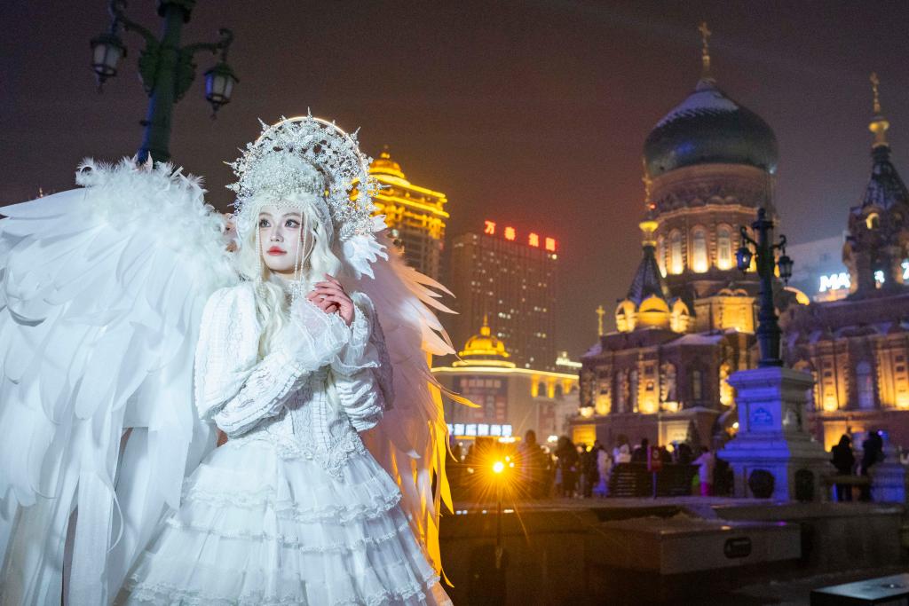1月23日,在哈爾濱市地標建筑索菲亞教堂附近,游客身著盛裝拍攝寫真。新華社記者謝劍飛 攝