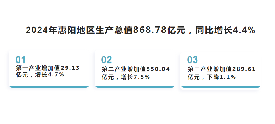 根據(jù)惠州市地區(qū)生產(chǎn)總值統(tǒng)一核算結(jié)果,2024年,惠陽區(qū)地區(qū)生產(chǎn)總值868.78億元,按不變價(jià)格計(jì)算,同比增長4.4%。其中,第一產(chǎn)業(yè)增加值29.13億元,同比增長4.7%;第二產(chǎn)業(yè)增加值550.04億元,同比增長7.5%;第三產(chǎn)業(yè)增加值289.61億元,同比下降1.1%。