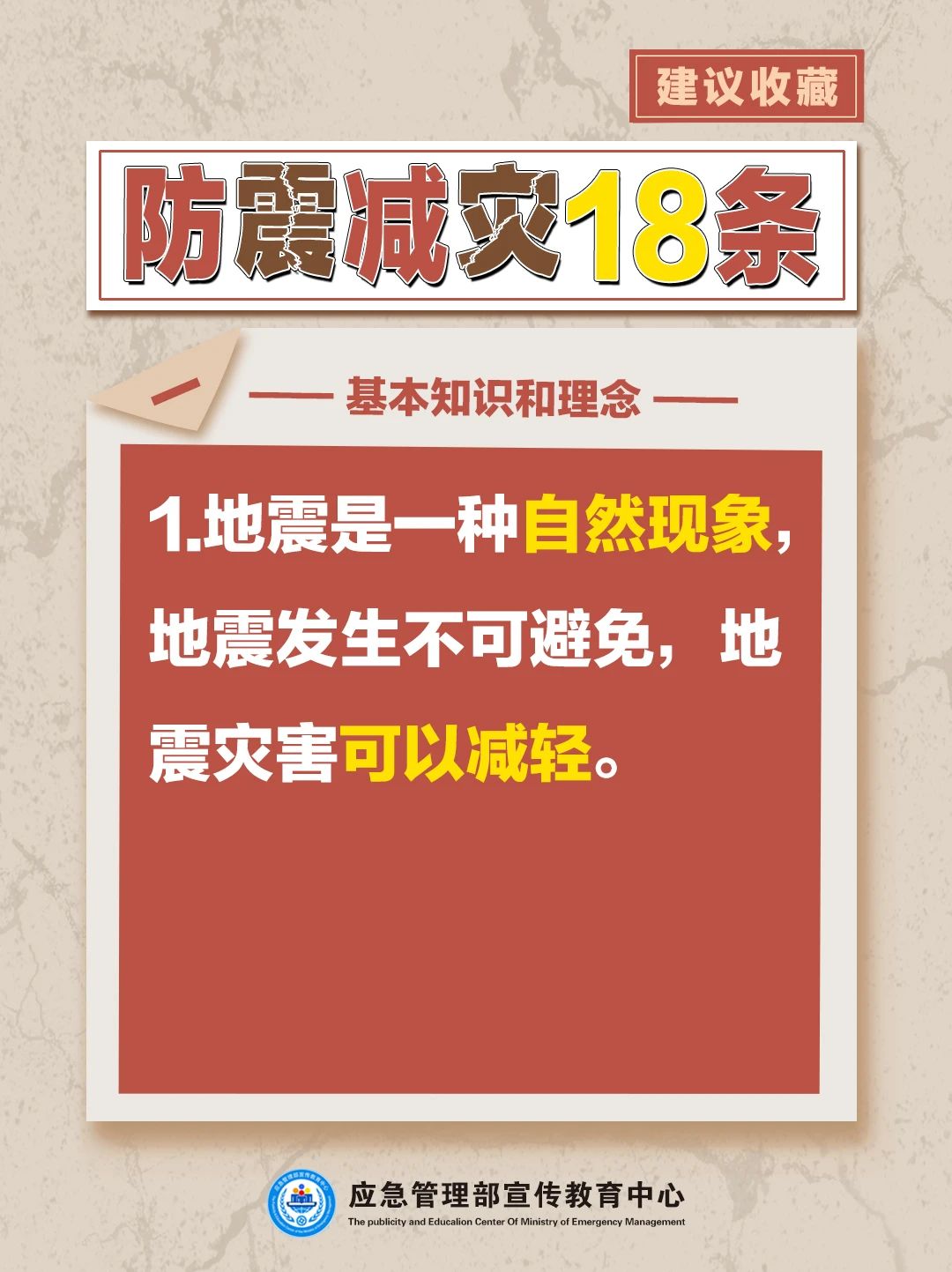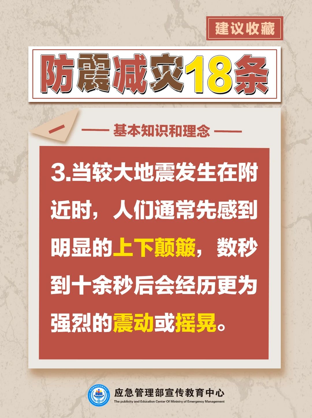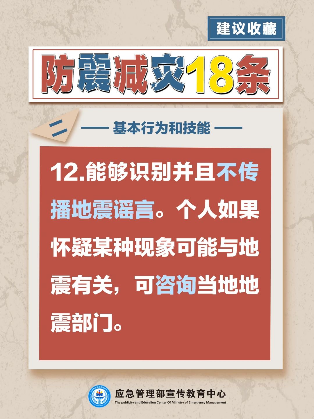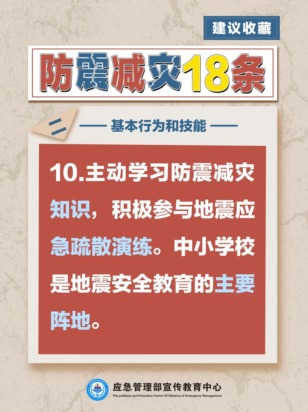 基本知識和理念共9條,包括科學認識地震、地震空間分布規律、地震震感、地震災害、地震觀測、地震預報、地震預警、震害防御、防震減災需要人人參與等?;拘袨楹图寄芄?/span>9條,包括主動學習防震減災知識、獲取地震信息服務、應對地震謠言、重視房屋抗震能力、做好應急準備、震時應急避險技能、震后自救與互救技能、震后生活技能等。