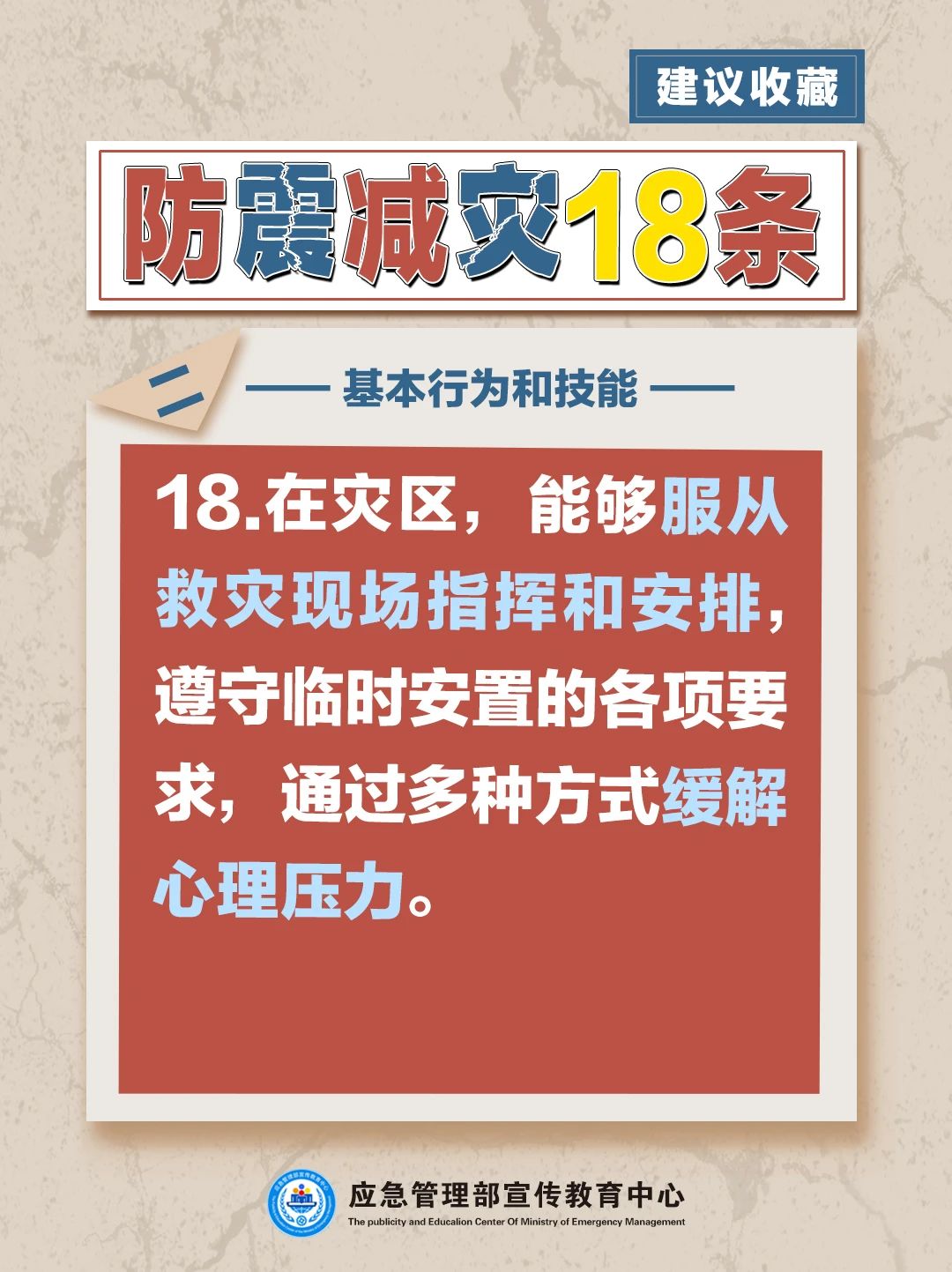 5月12日,中國地震局發布《防震減災基本知識與技能大綱》(簡稱“防震減災18條”)。這是全國層面首次編制的防震減災基本知識與行為技能規范,共包括18條內容及其釋義。